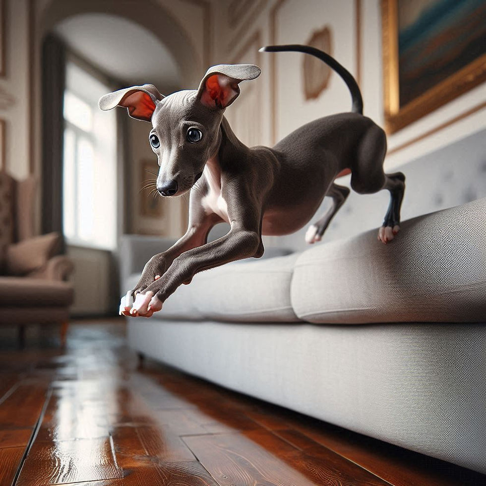 5. Prevent jumps from excessive heights: Italian Greyhounds are prone to leg injuries due to their slender build and thin bones. Avoid allowing them to jump off furniture, stairs, or any elevated surfaces.